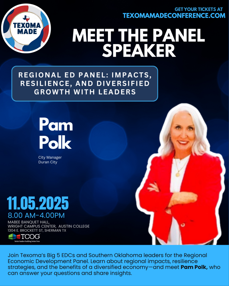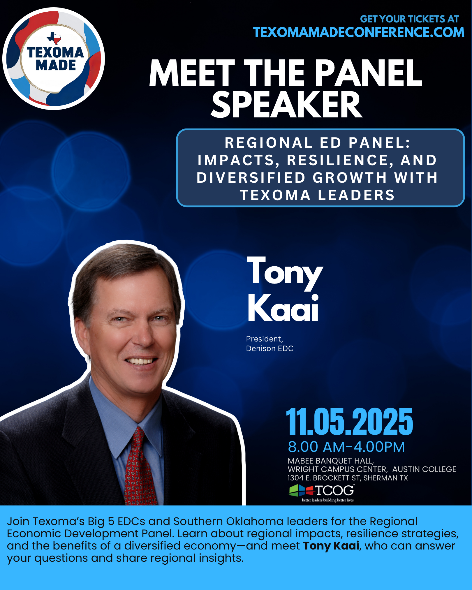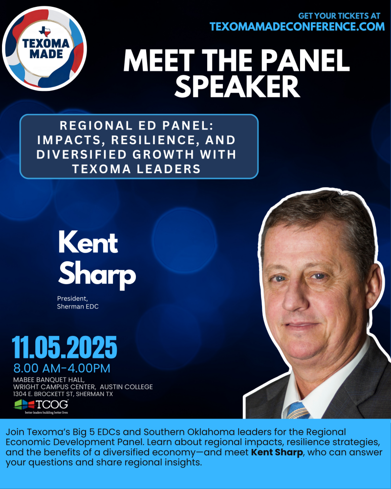 The Texoma Made Conference will be held on November 5, 2025, in Sherman, Texas, bringing together leaders, entrepreneurs, and innovators to discuss strategies for driving economic growth and resilience in the northern Texas/southern Oklahoma (Texoma) region..